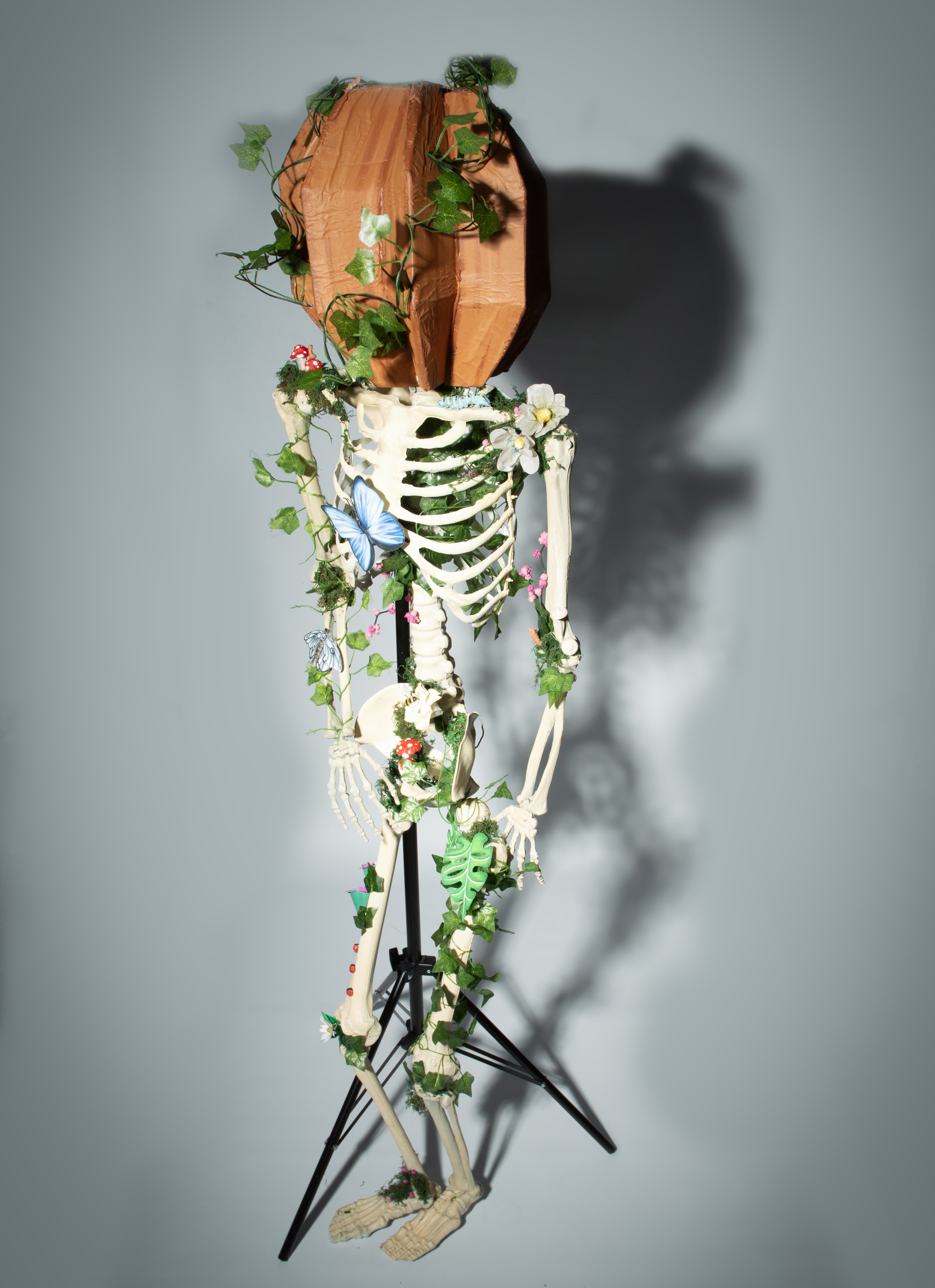 A clumsy skeleton who once tripped into a pumpkin patch during the tumble one got stuck on his head. He never left, causing him to be overgrown by flowers and vines. Butterflies and other animals now make him one with nature.